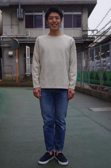 スッキリシルエットのBRESTに比べゆったりとしたボックスシルエットのMATELOT。ボートネックですがクルーネックに近しいスッキリとした首元のバスクシャツです。洗うことで目が詰まっていき、ドライタッチな質感になりつつも、柔らかさを保つところは他ブランドのバスクシャツにはない持ち味です。裾にあるのは戦艦ジャンヌダルク号の旗章で、フランス海軍のオフィシャルサプライヤーであった証です。肩の部分を重ねて縫い合わすダブルパネル構造はダルボーが特許を取得しているもの。マトロは脇に三角のマチを作っており、ストレスの軽減と耐久性を高めています。スリットにはかんぬき留めが施されており、永く愛用できるバスクシャツです。