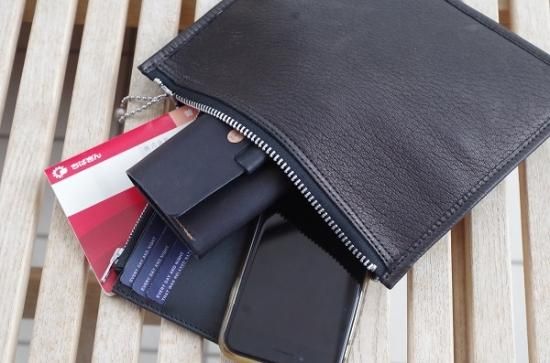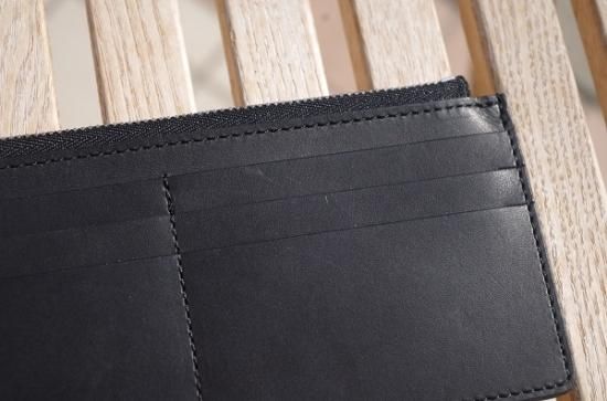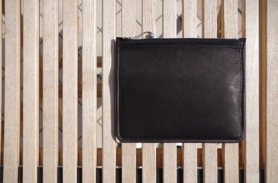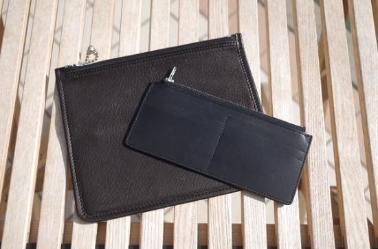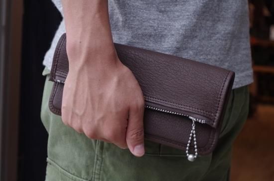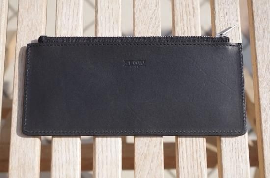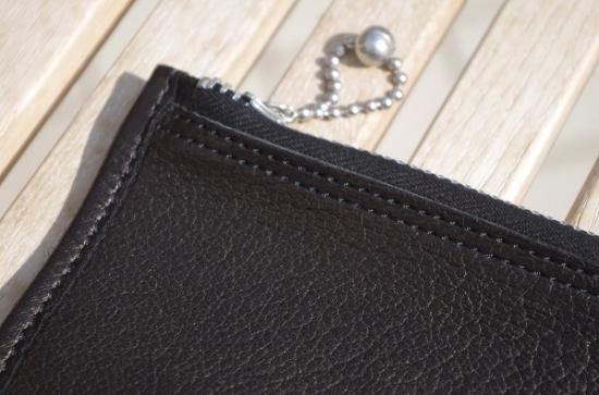 クラッチとお財布を融合させた形のお財布。カードケースは取り外しが可能でお好みの使い方をして頂けます。デザインのアクセントともなっているWALDESボールチェーンは1930年代の復刻。当時のライダースジャケットの引手などに用いられた金具です。お財布の機能としては勿論、スマートフォンや鍵なんかも収納でき、通帳など常に持ち歩きされる方にも好評頂いております。シンプルな中にSLOWらしいアクセントが光ます。コインポケットが1つにカード収納が4つあり、お札は二つ折りで納めるとマチ薄ながら十分な収納力です。周りと差がつく洒落たお財布です。すこし大きいシルエットですが、気持ちよい手触りなのでクラッチのように手で持って出かけたくなるような渋いお財布です。