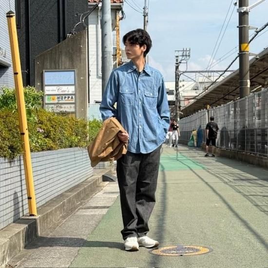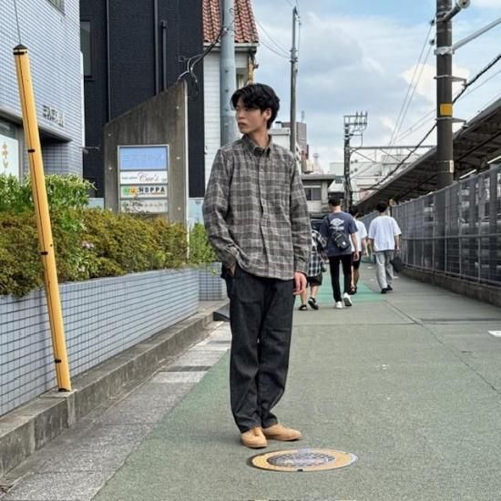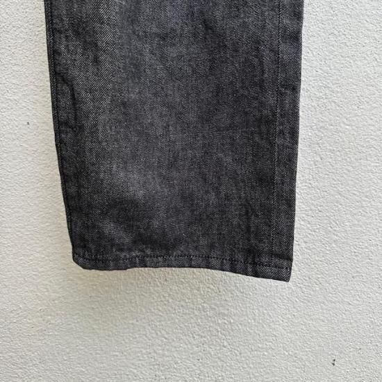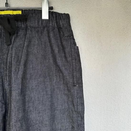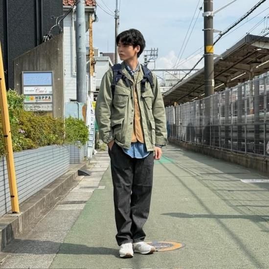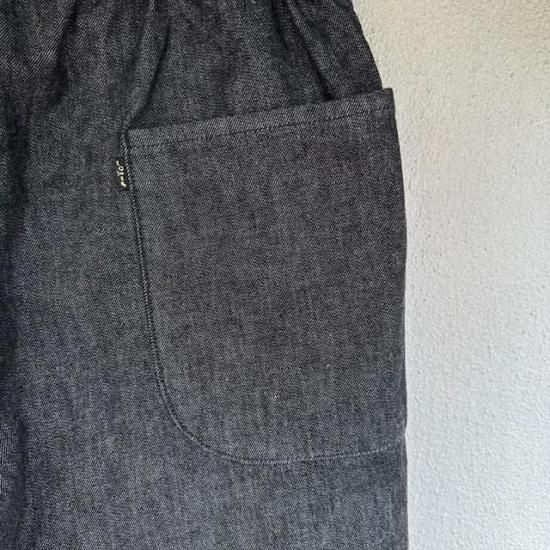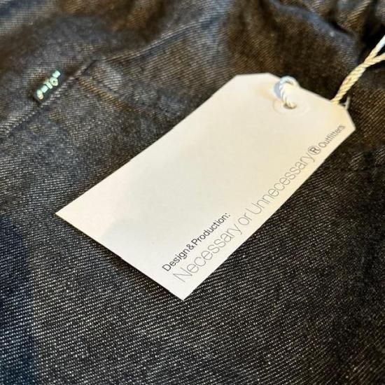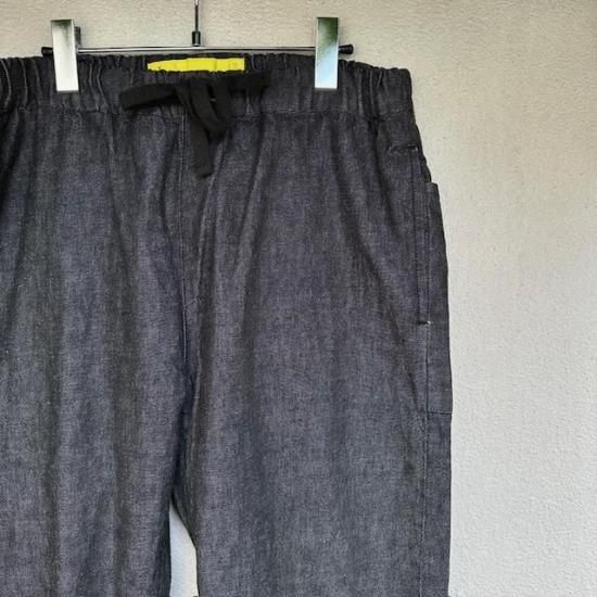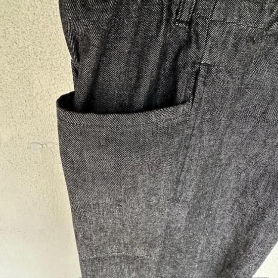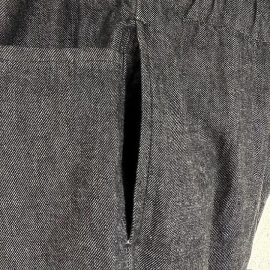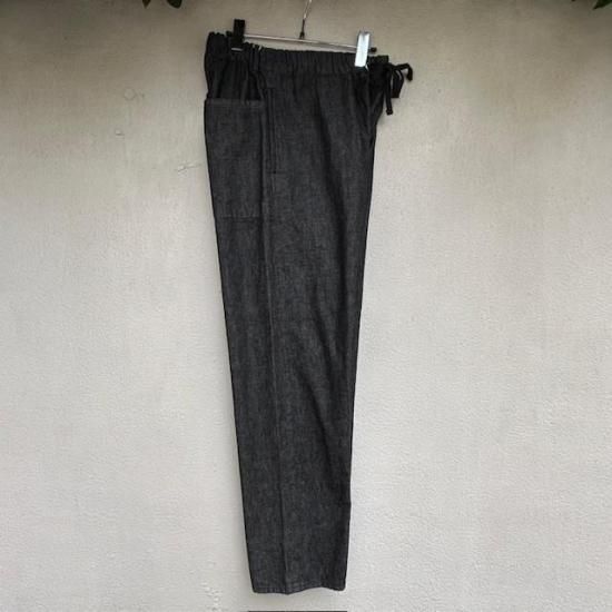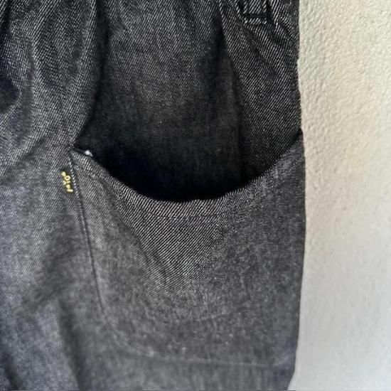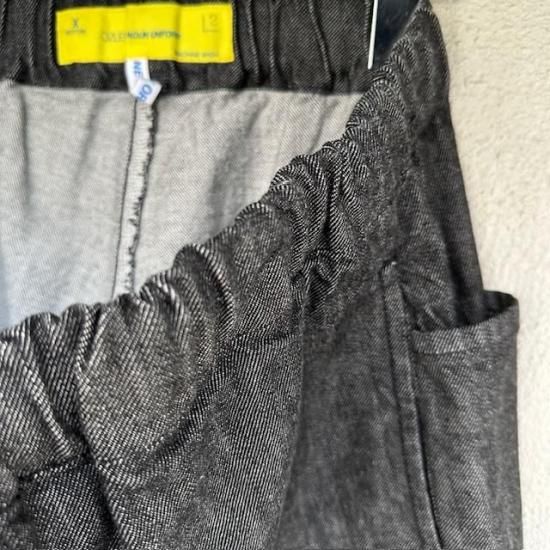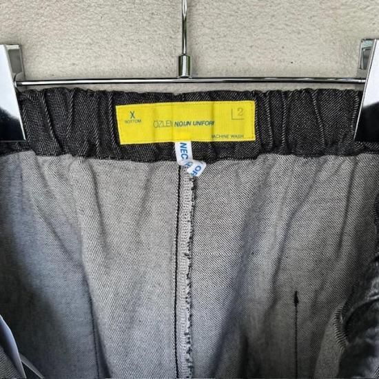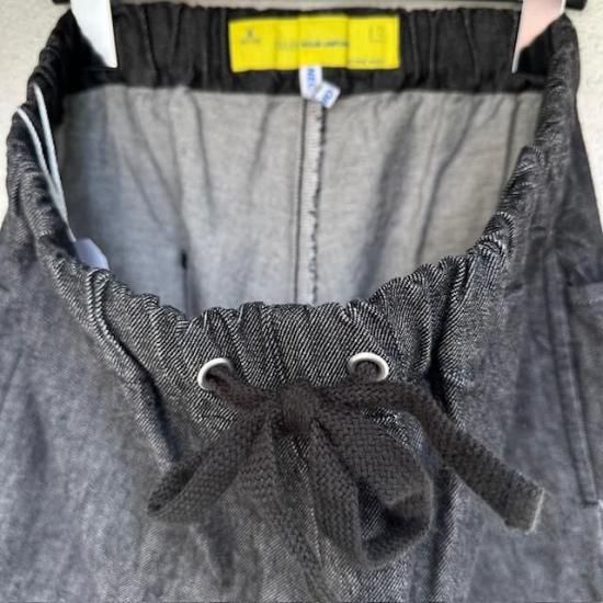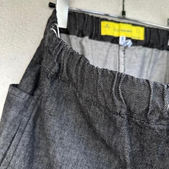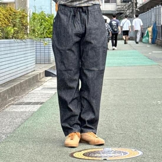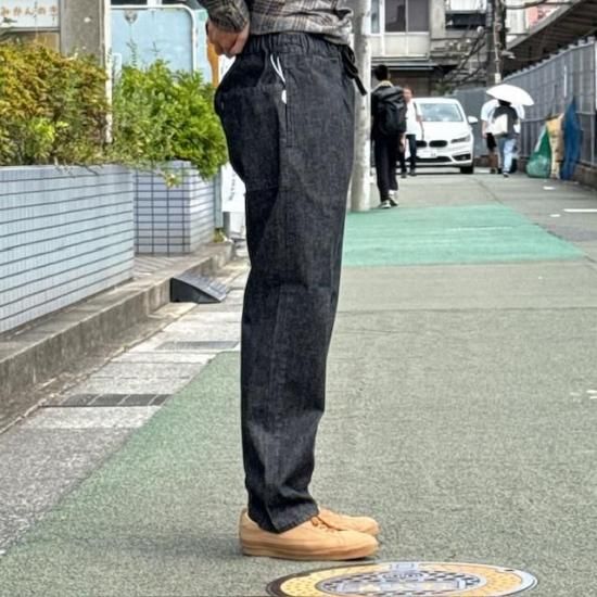 N.O.UN定番イージーパンツ 味わい深い経年変化が楽しめる DENIM ver.スタイリングに合わせたサイズアップの着こなしもおすすめ。縦糸に白糸を使ったブラックデニムは綺麗に色落ちしそうですね。イージータイプのウエスト部分はかなりの幅がございます。緩く履きたいのであれば3(L)を、程よいゆとりが好みであればサイズ2(M)を。楽に履けてちゃんとしている、そんなブラックデニムのパンツはちょっと珍しいですね。