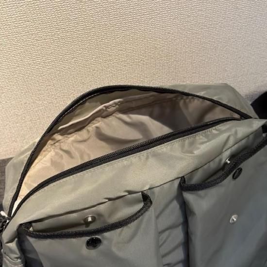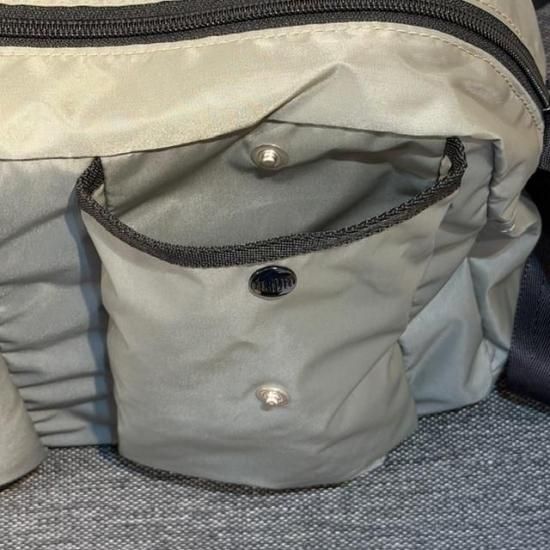 ジッパーと蓋の2重構造や、内側のドリンクポケット、高さのある2つのポケットが特徴。
