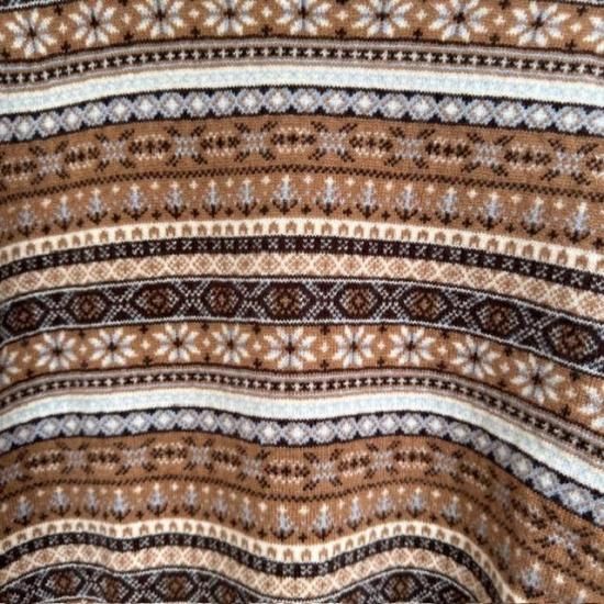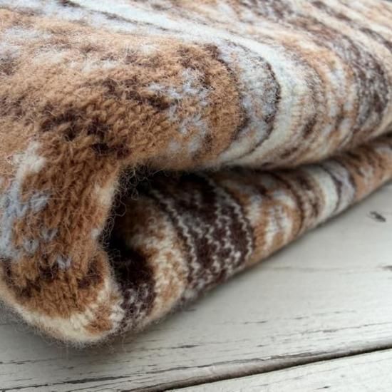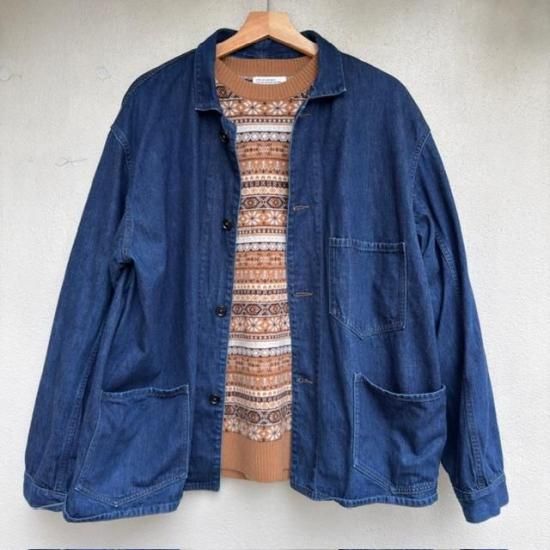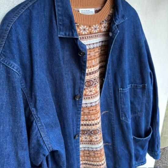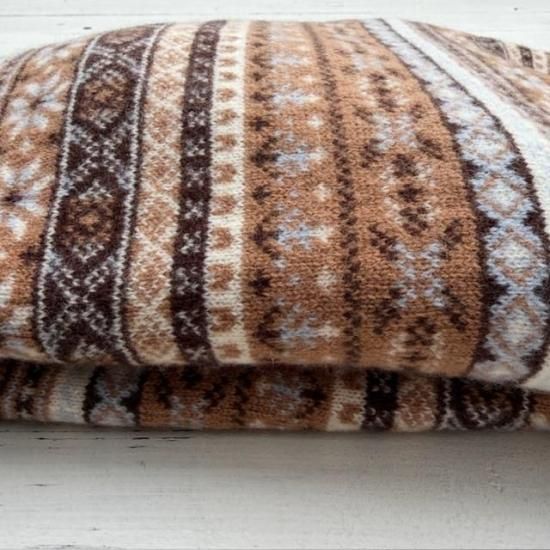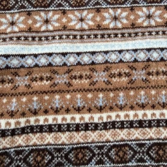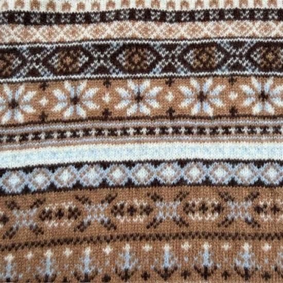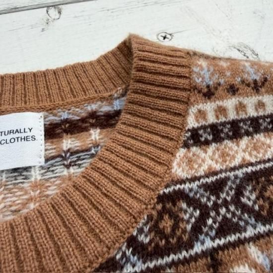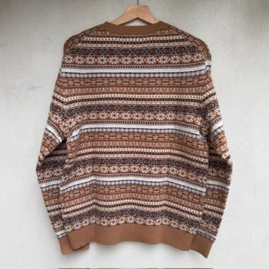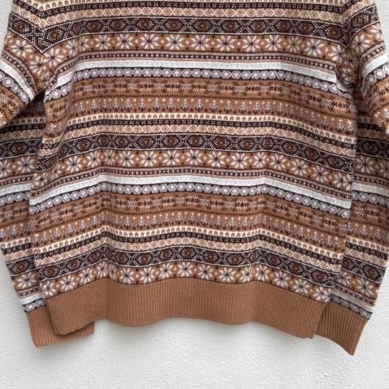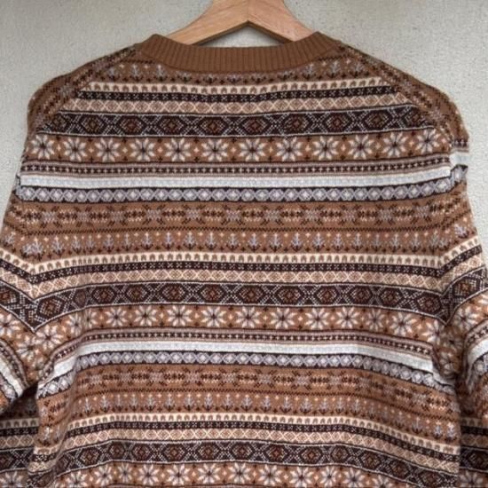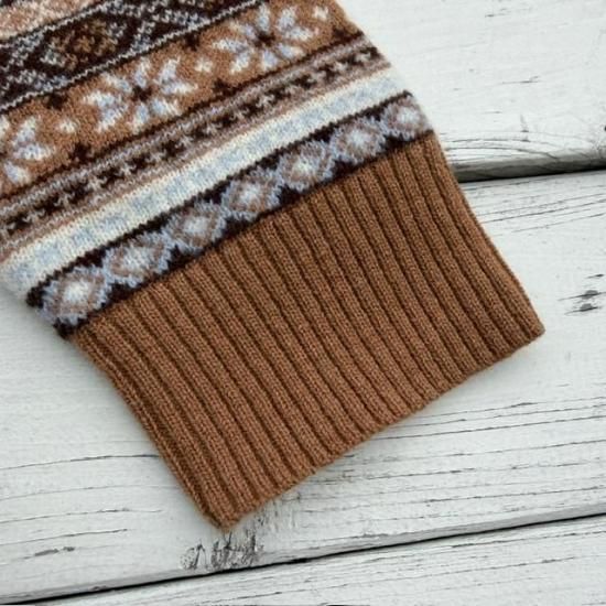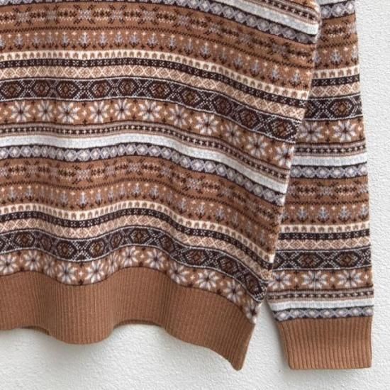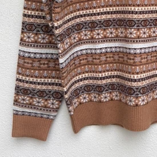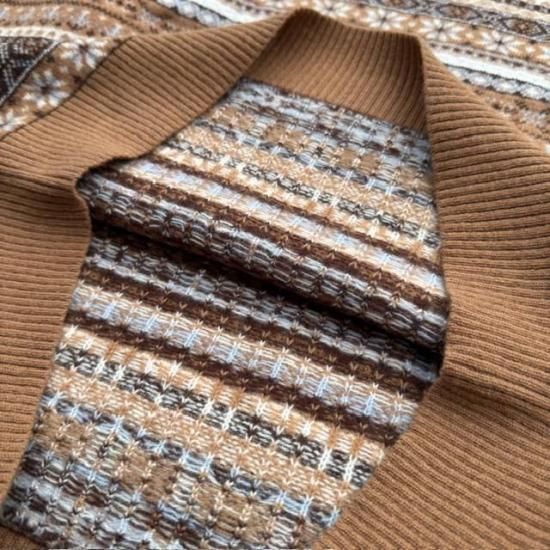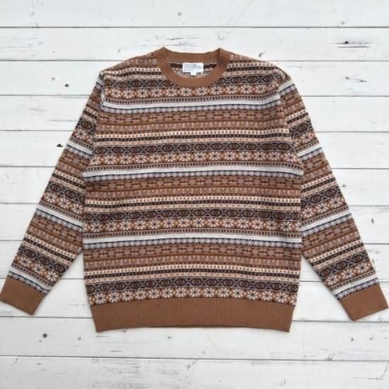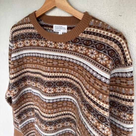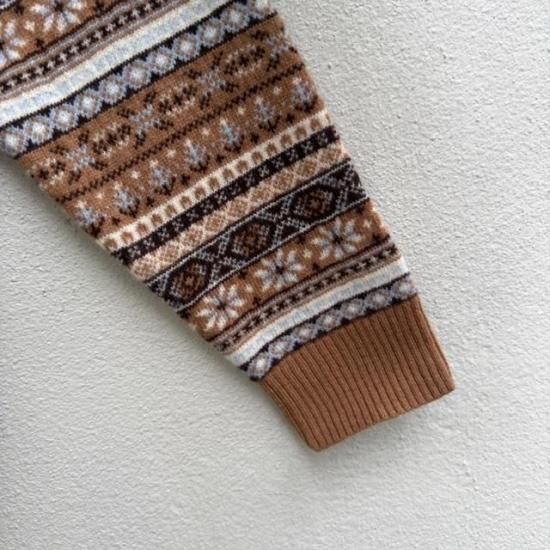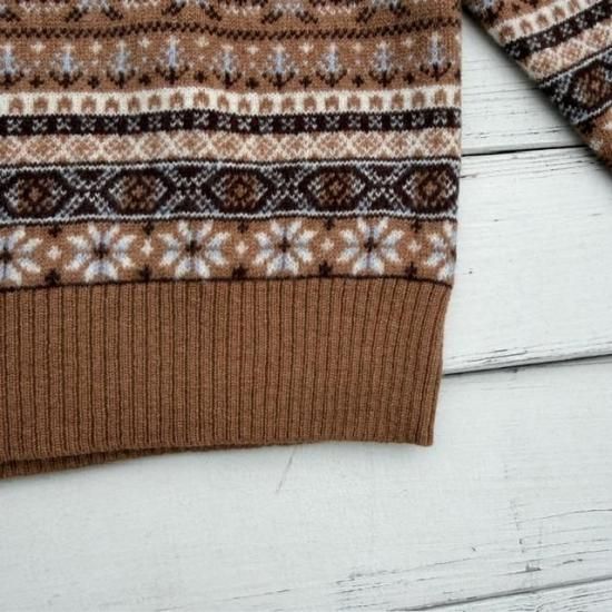 上品なジャガード編みのクルーネックセーターとなります。5色から7色の糸を使い、ジャガード機を使って編み立てられております。プリントとは一味違う本物の風合いを味わってください。メリノウール100%ならではの色の良さもポイントとなっております。毛糸は細いけど、少し緩めなサイズ感でも着れるよう作られております。着丈は割とスッキリ、身幅に程よいゆとりのあるサイズ感なのでご安心を。サイズ感についてのご質問はお気軽にどうぞ。