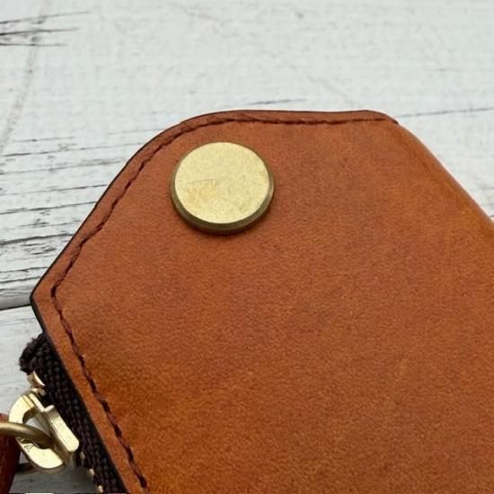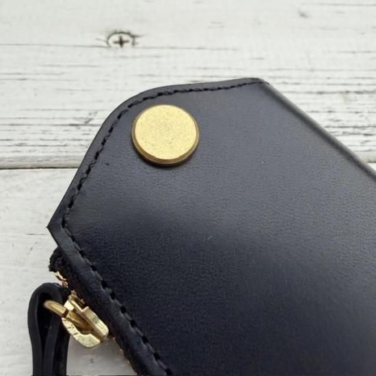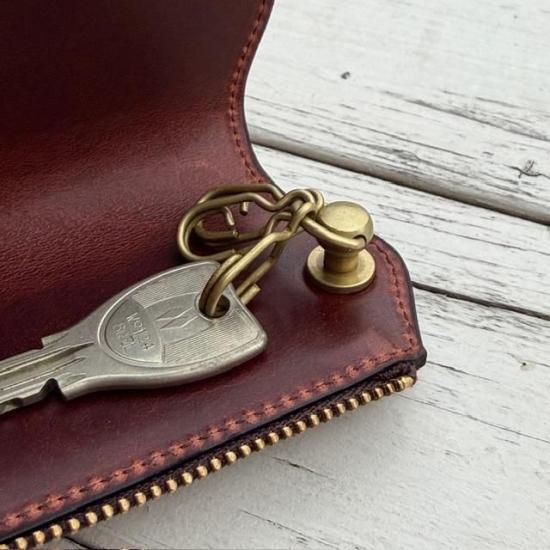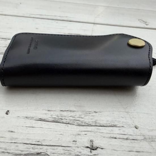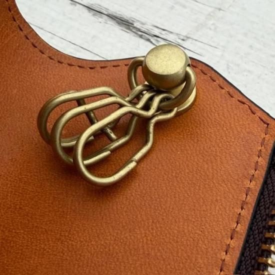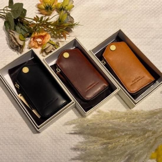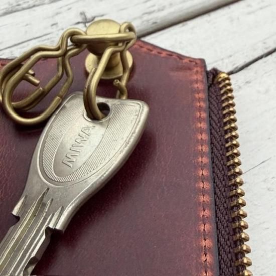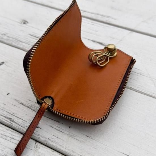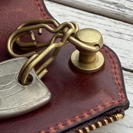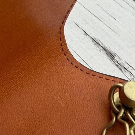 手のひらにすっぽり収まるサイズで、鞄やポケットにもスムーズに収納できるキーケース。裏面には薄くすいたハービーレザーを丁寧に貼り合わせており、高級感のある仕上がりが特徴です。特徴的なキーホルダー金具は、日本の職人が一点一点手作業で削り出した別注品。磨き上げられたコバと、部位ごとに厚みを調整したレザー、細部にまでこだわり抜かれた唯一無二のデザインは、使い勝手の良さだけでなく丁寧な手仕事が感じられる逸品です。