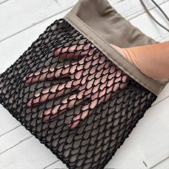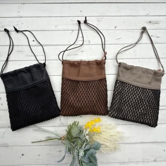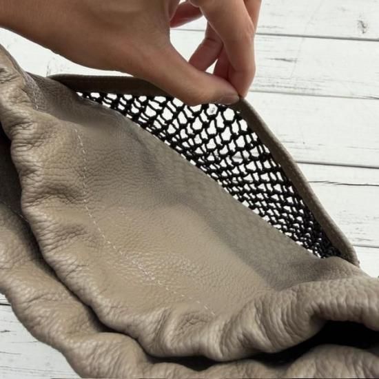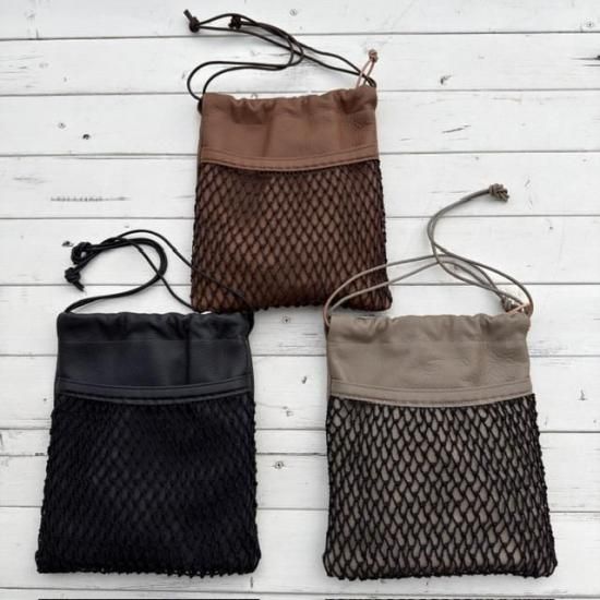 上質なレザーを使用し、フロントには英国製フィッシングネットを染色したメッシュ素材をあしらったショルダーバッグ。レザーの重厚感とネットの軽やかさが絶妙に調和し、ほどよくカジュアルな仕上がりになりました。前面のネットポケットは“見せる収納”にも最適で、視認性が高く、出し入れもスムーズです。ショルダーストラップは結び方を変えるだけで手持ちと肩掛けを簡単に切り替えられ、ファッションやシーンに合わせて自由にアレンジ可能。性別を問わず、日常使いにおすすめの一品です。