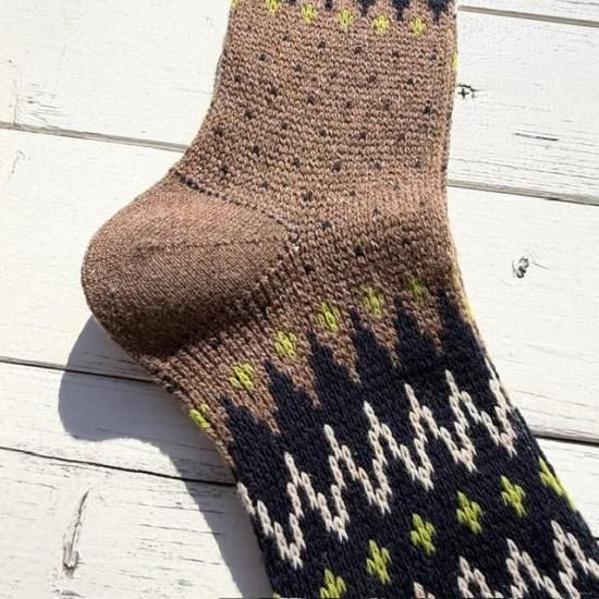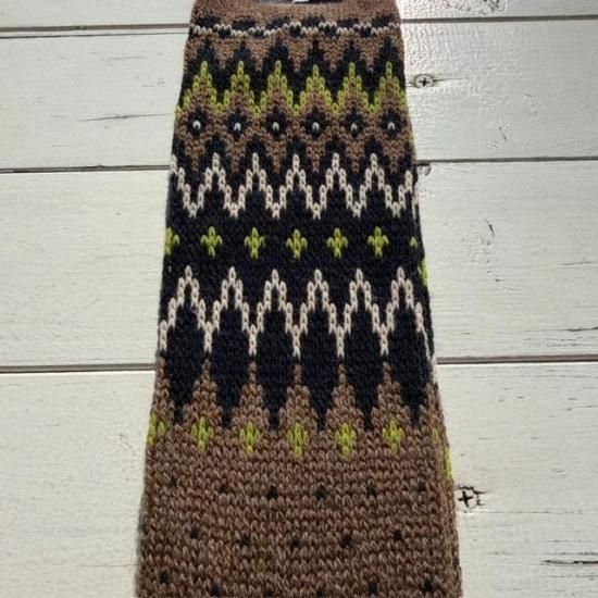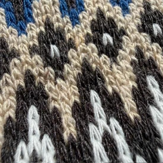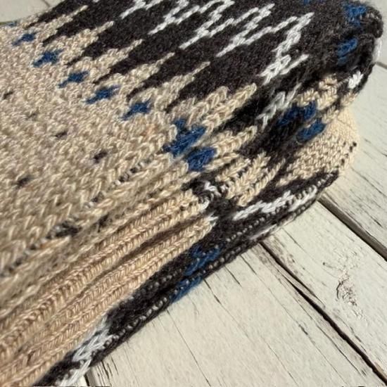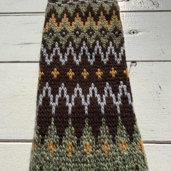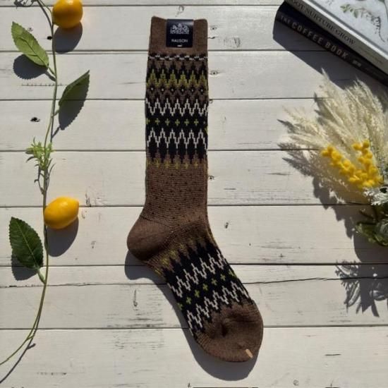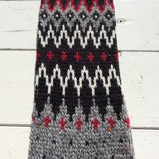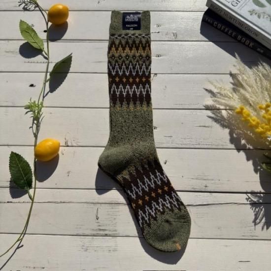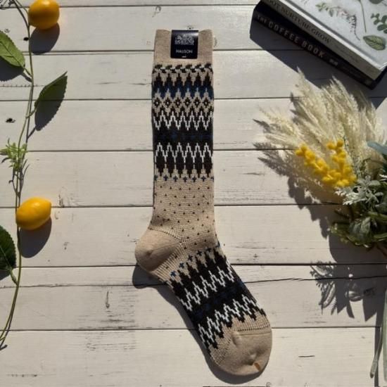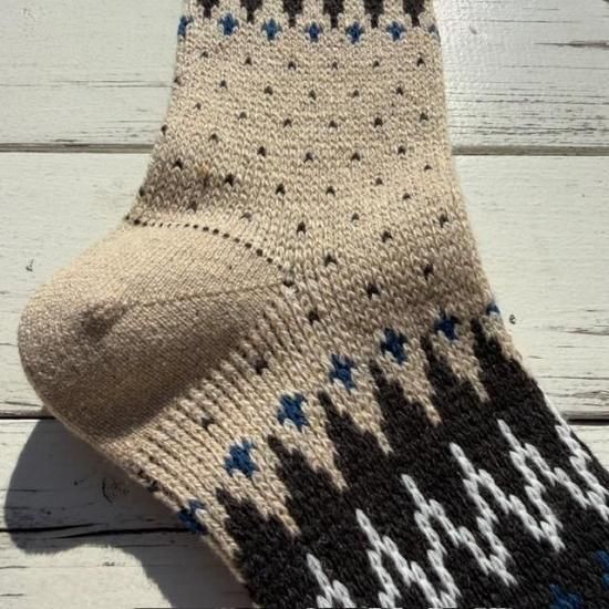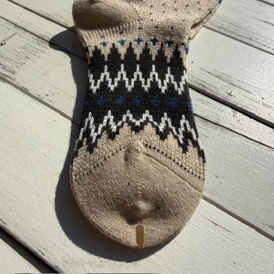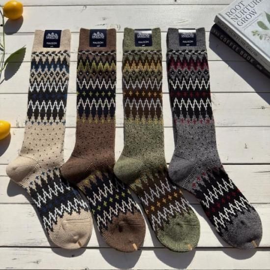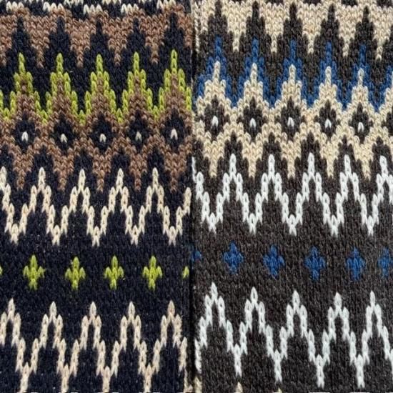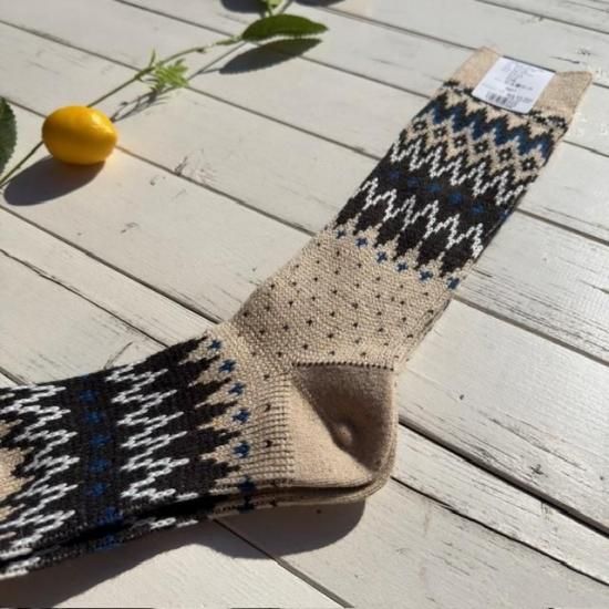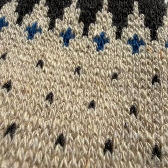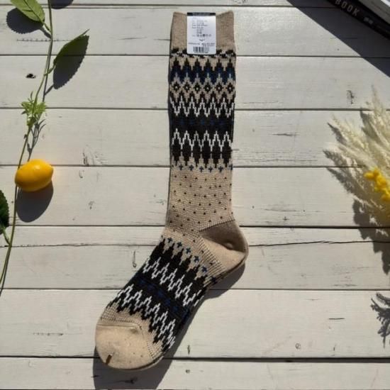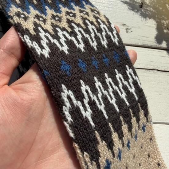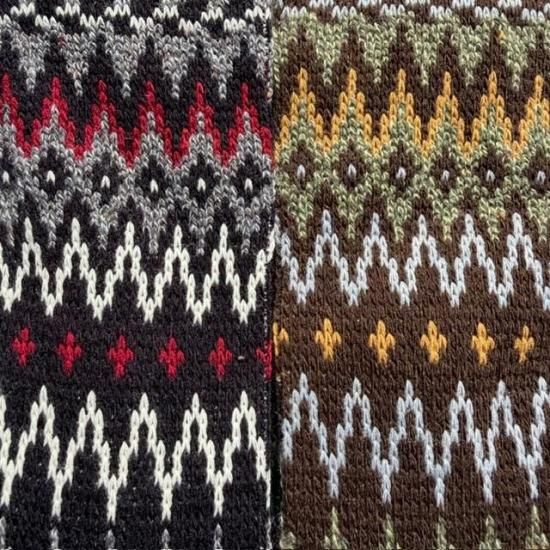 まるでセーターのようなノルディック柄の極厚ジャカード編みロングホーズ。膝下丈。