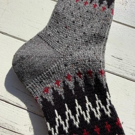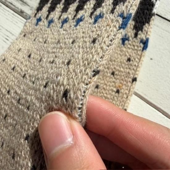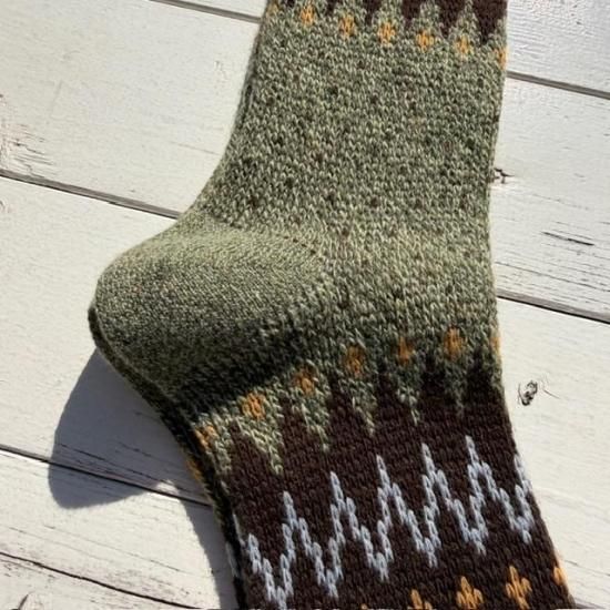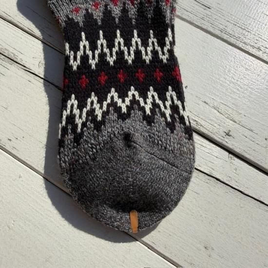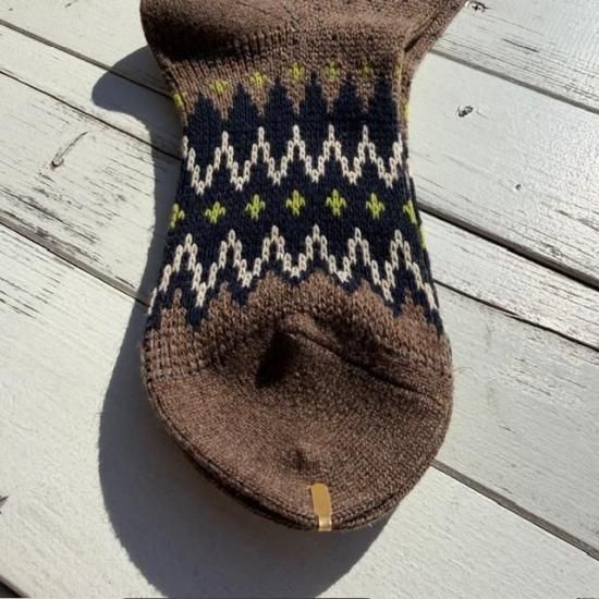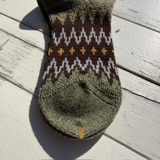 登山靴下用の希少な大口径ジャカード編機で編み上げており、特別な肉厚感と重量感を備え、防寒性は抜群。